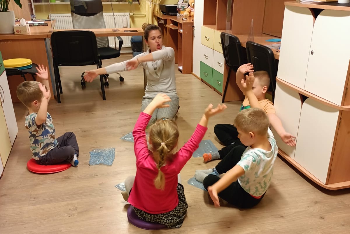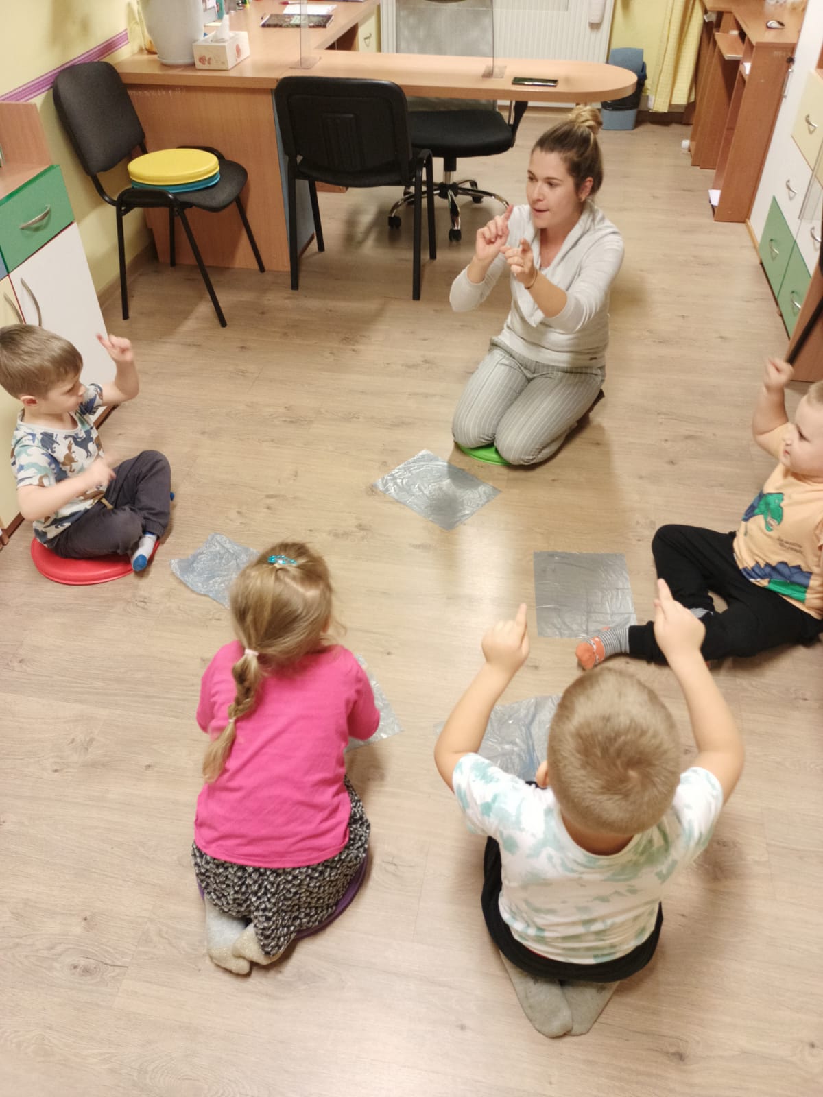 „Deszczowa pogoda” była inspiracją dla zajęć logorytmicznych. „Wesołe Smyki” bawiły się wspaniale rozwijając swoje umiejętności.